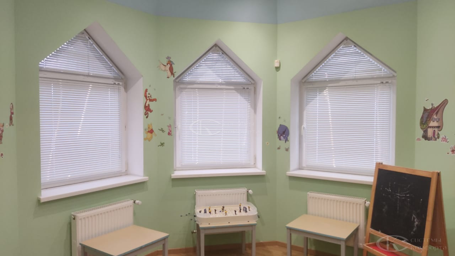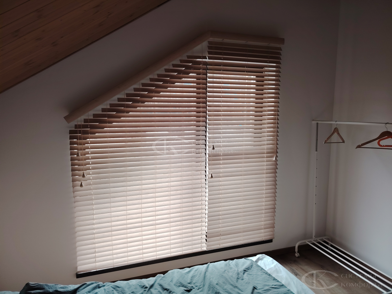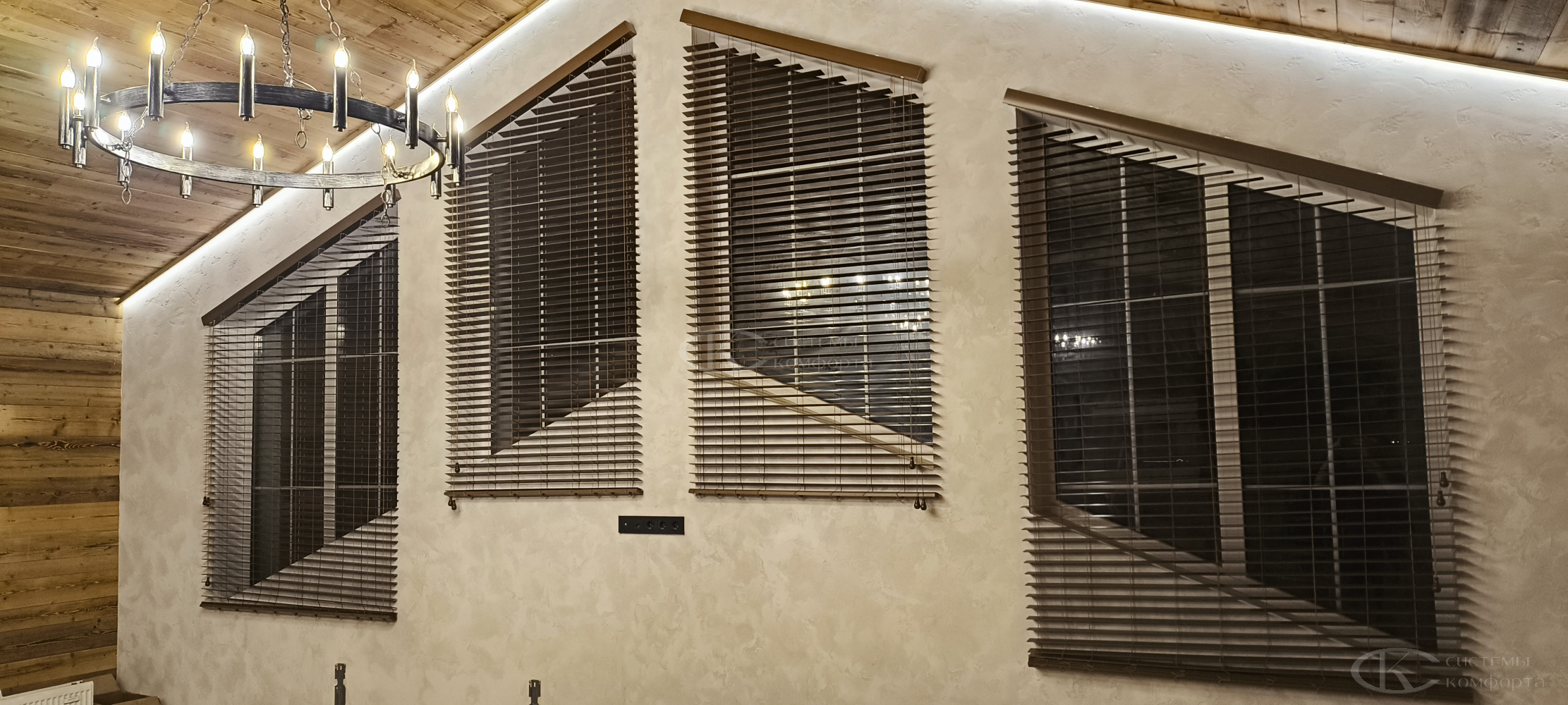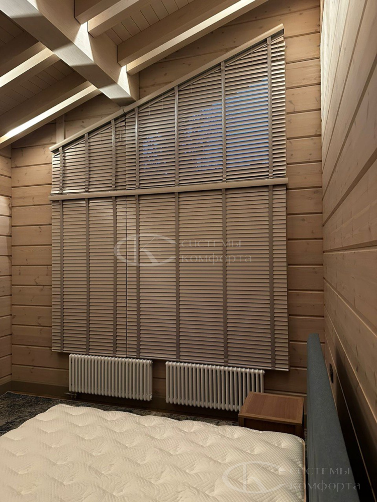 Компания «Системы комфорта» изготавливает жалюзи на треугольные окна и на другие проемы нестандартной формы по индивидуальному заказу. Чаще всего они встречаются в мансарде: окно треугольной формы размещается на фронтоне и помогает обеспечить естественное освещение подкровельного пространства. Однако и в других помещениях могут быть оконные проемы необычной формы, для которых необходимо изготовить персональные системы управления светом.