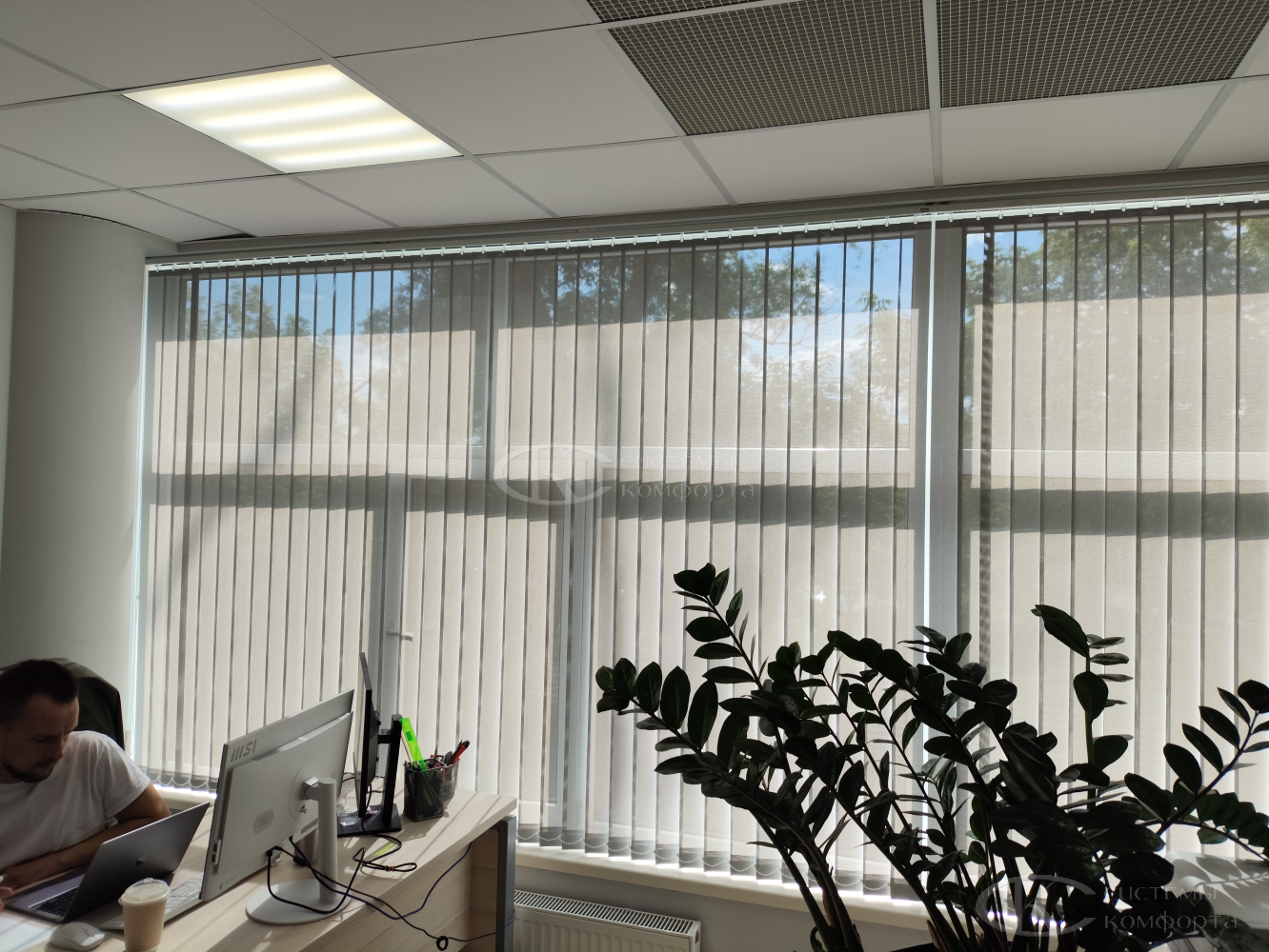 Вертикальные тканевые жалюзи — недорогой вариант солнцезащитной системы для дома или офиса. Они хорошо защищают помещение от солнца. Недостатком такой системы считаются быстрая поломка при неаккуратном обращении и загрязнение ткани при проветривании помещения. Но если очистить от грязи и пыли их не получается, то задача решается путем недорогой замены ламелей. Из преимуществ можно отметить огромный выбор цветов и фактуры, а также возможность нанесения фотопечати: картинки или логотипа. Бесплатный замерщик поможет выбрать модель и определиться с решением. Персональный менеджер поможет сделать предварительный расчет.